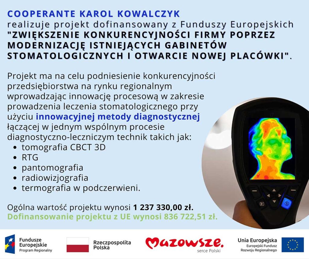 COOPERANTE KAROL KOWALCZYK zrealizował projekt dofinansowany z Funduszy Europejskich „ZWIĘKSZENIE KONKURENCYJNOŚCI FIRMY POPRZEZ MODERNIZACJĘ ISTNIEJĄCYCH GABINETÓW STOMATOLOGICZNYCH I OTWARCIE NOWEJ PLACÓWKI”.